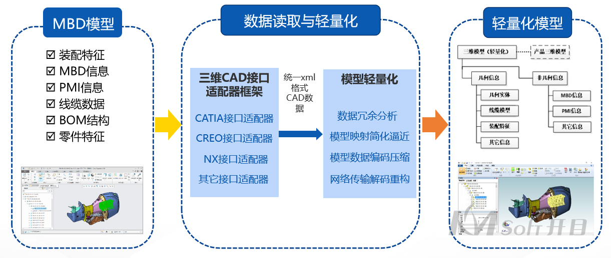 开目3DAST系统深度适配主流三维CAD软件,通过智能压缩优化技术,在完整保留原始模型结构、尺寸、属性等关键信息的前提下,大幅降低模型体积,确保运行流畅。无论是本地文件还是通过PLM系统调用的模型数据,都能实现快速加载与精准解析,彻底解决了不同软件间数据不兼容的行业难题。