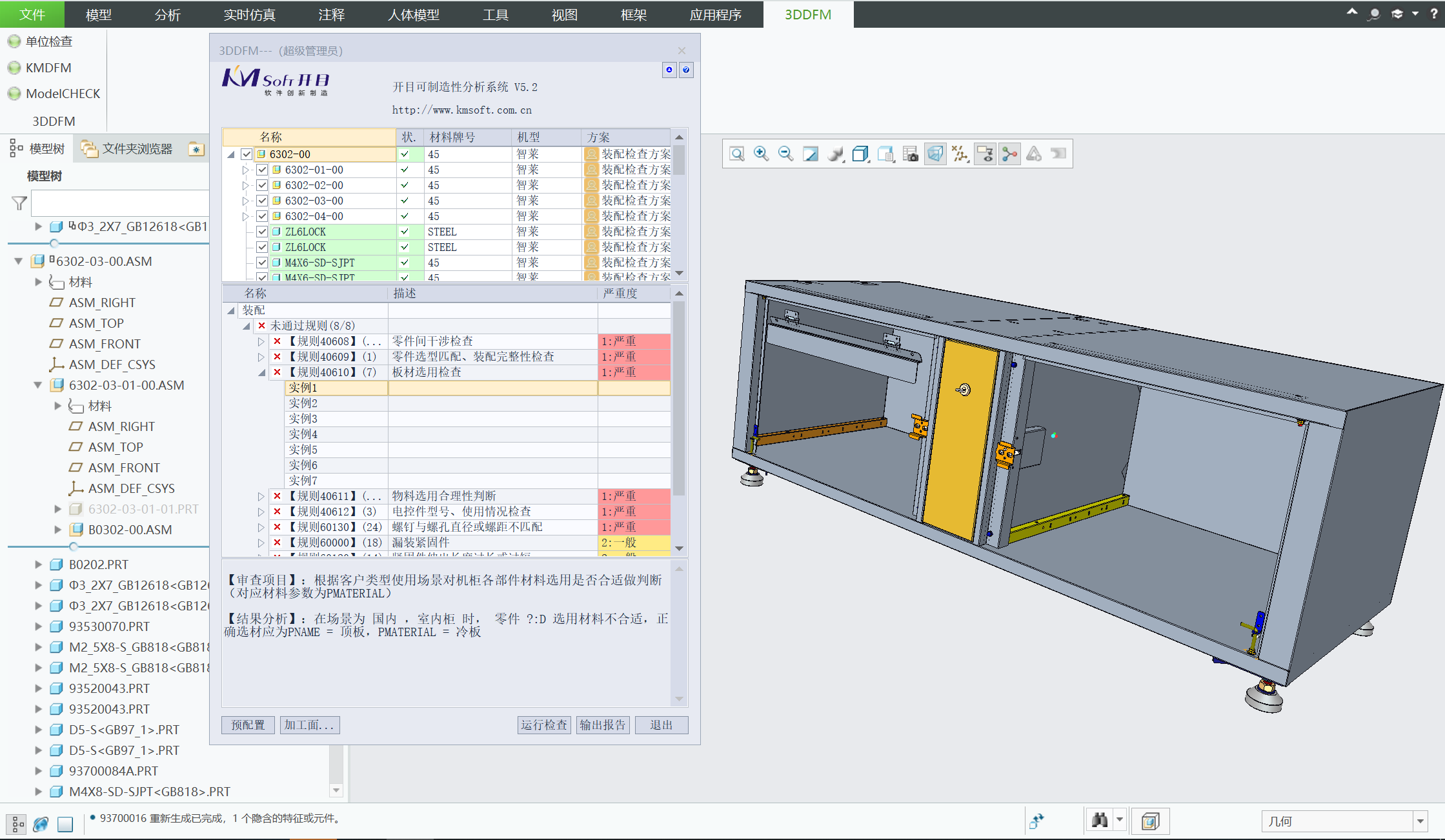 4、智能制造特征识别与审查,智莱科技主要的工艺制造领域包含钣金、装配、规范性、标注等,开目3DDFM快速全面准确的进行制造特征识别与审查,且不受零件建模顺序和建模历史的影响,能够处理非参数化建模的模型数据源。